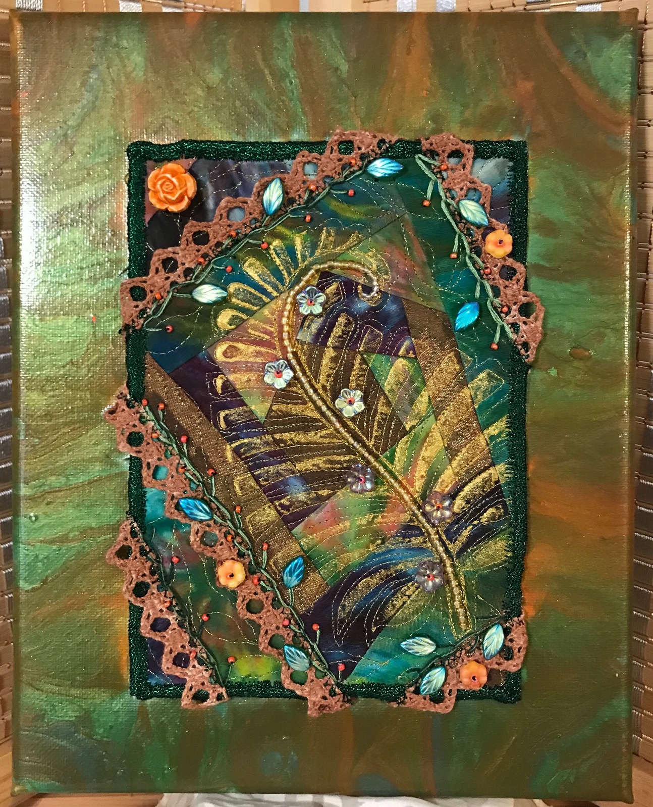 After the paint had dried, I free motion quilted the piece using gold metallic thread. I quilted in a vining leaf pattern and outlined the fern. The edge is finished with a satin stitch using Madeira FS20 metallic thread.